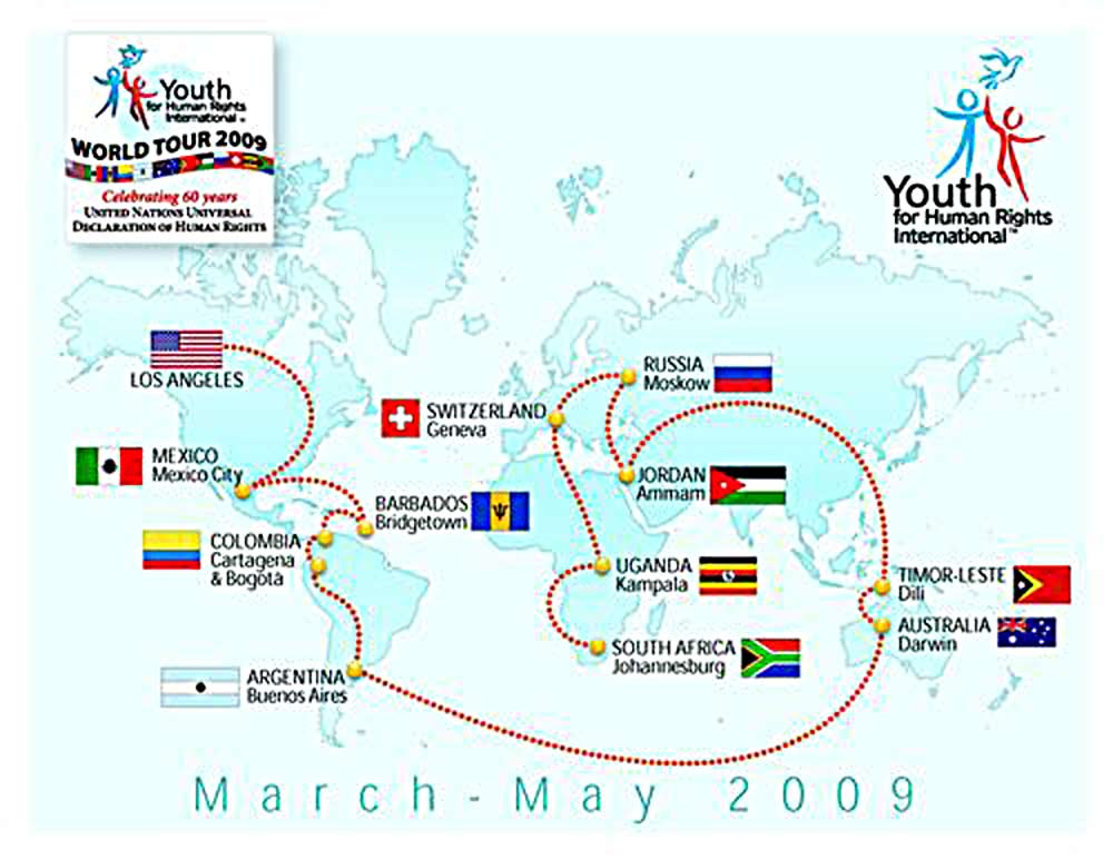 2009年YHRI世界ツアーには、アルゼンチン、オーストラリア、バルバドス、コロンビア、ヨルダン、メキシコ、ロシア、南アフリカ、スイス、東ティモール、ウガンダ、およびアメリカ合衆国が含まれます。地域イベントばかりでなく、政府高官や指導者との会合はどの国でも行われます。また、ツアーをさらに普及するために、私たちの活動はビデオや写真で撮影されます。