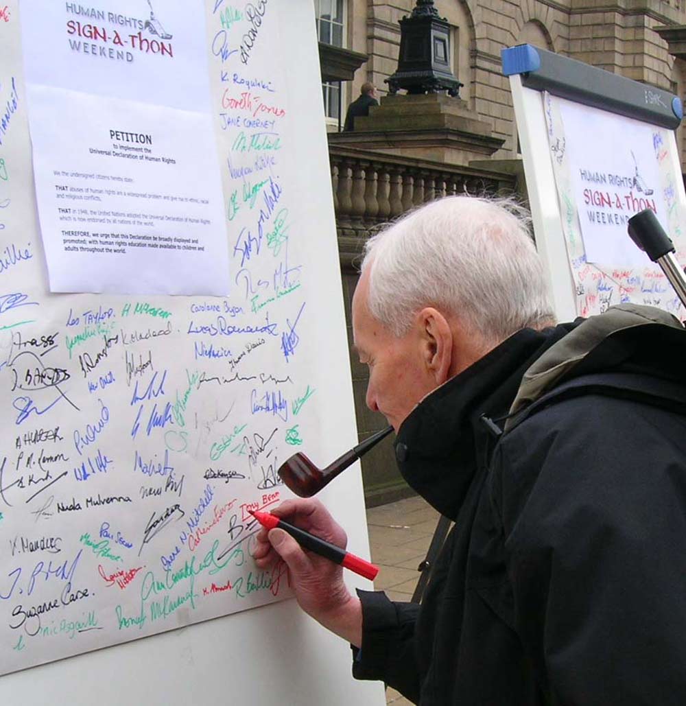 Первая акция по сбору подписей в защиту прав человека, проводимая на выходных, охватывающая тысячи граждан, которые подписывались под обращением о необходимости просвещения о правах человека, имела огромный успех. Объединившись с группами и организациями со всего мира, придерживающихся тех же взглядов, международное движение «Молодёжь за права человека» собрало подписи под обращением о необходимости сделать просвещение о правах человека обязательной частью образования каждого ребёнка. В Копенгагене, (Дания) экран в 35 квадратных метров рекламировал синга тон на главной городской площади и в тоже время 200 добровольцев собрали 10 000 подписей.